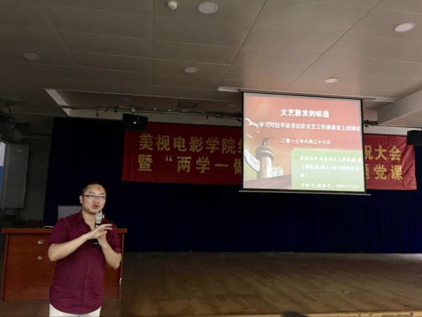 2017-06-29 按照 酒店偷拍 党委的组织生活计划和“两学一做”的具体安排, 酒店偷拍 于2017年6月27日下午四点在学院阶梯教室进行了“两学一做”学习教育专题党课。马克思主义学院魏强副教授应邀为 酒店偷拍 师生党员上党课。党课由学院党委副书记李阳模主持,全院教工党员和学生党员共一百余人参加了党课学习。 魏强副教授授课的题目是:文艺散发的味道——学习习近平总书记在文艺工作座谈话上的讲话。从“一种时代的关切”...