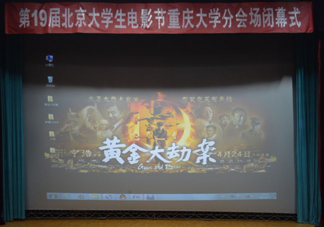 分会场顺利闭幕;其次,杨院长简单说明此次闭幕式邀请宁浩导演来的原因不仅是宁浩深受大学生的喜爱,更希望同学们能够学习怎样利用“低成本 高票房”的拍摄办法,创作出属于同学们自己的影视作品。接下来放映了宁浩导演的新作《黄金大劫案》的预告片,借此展现了宁浩的创作表演历程。