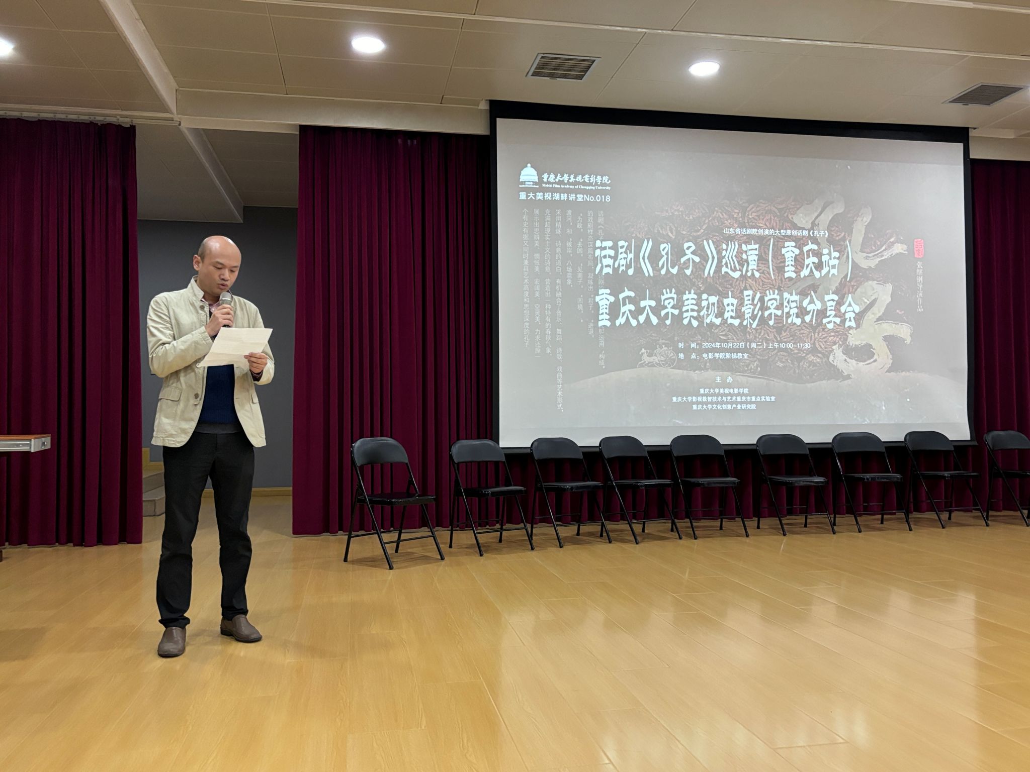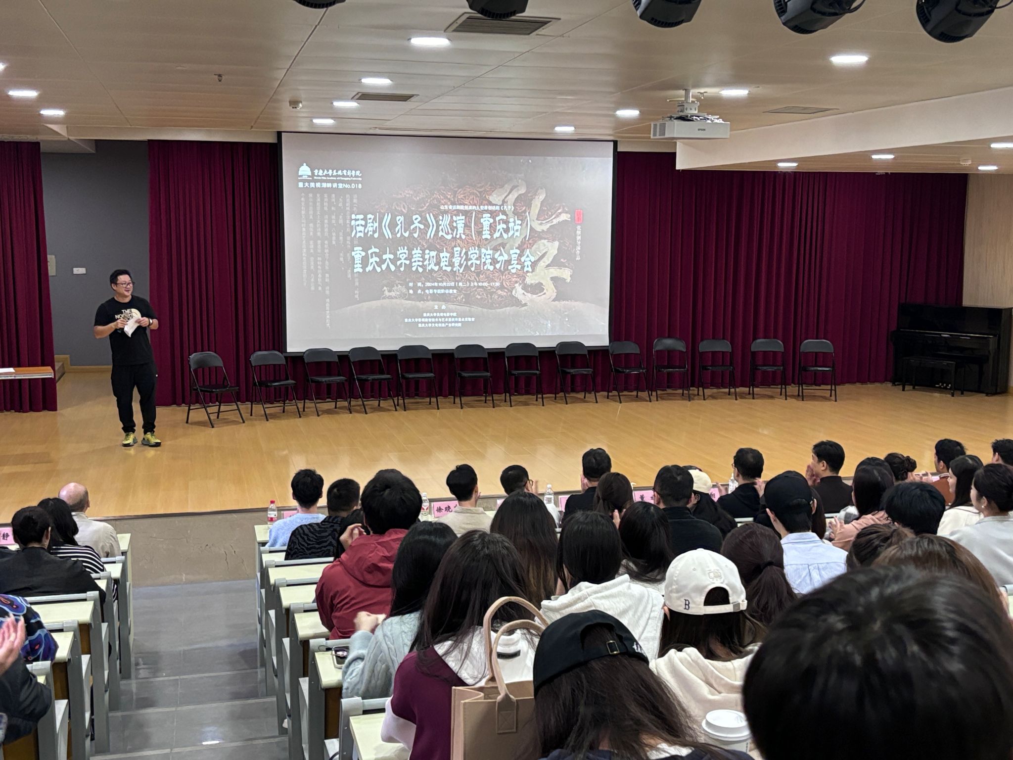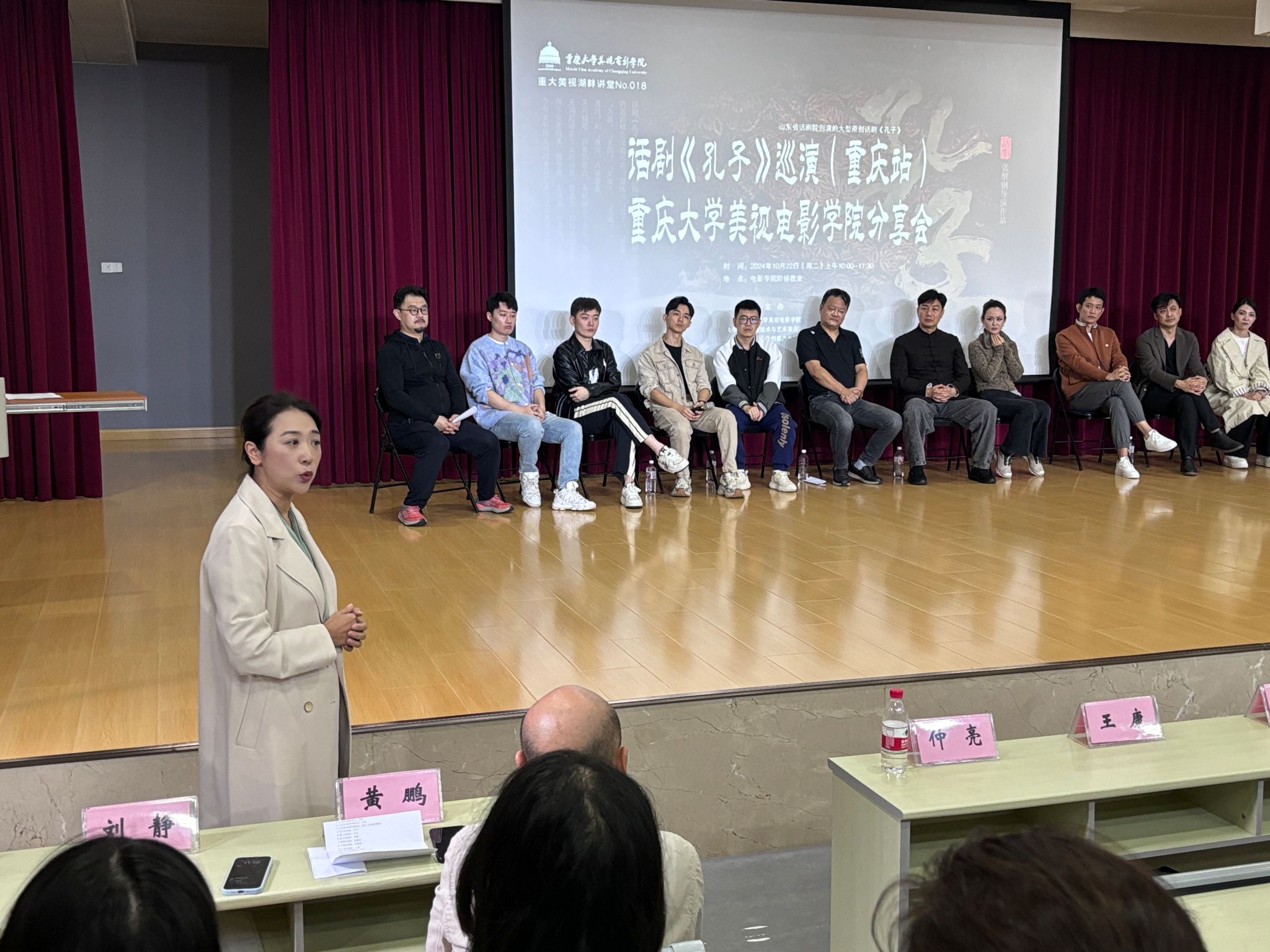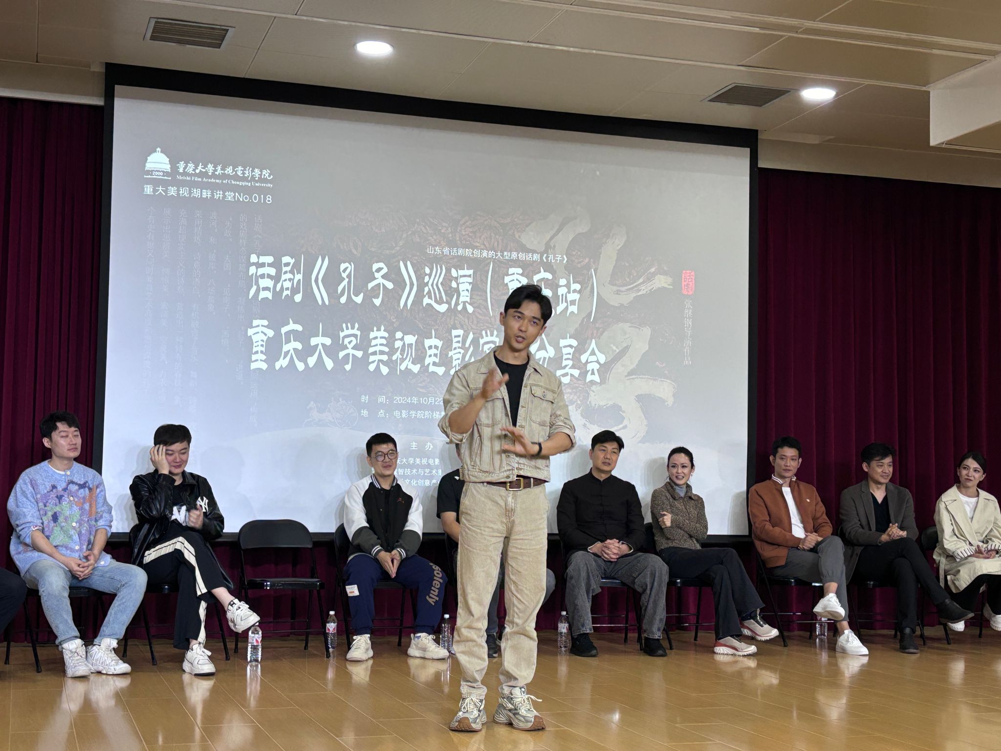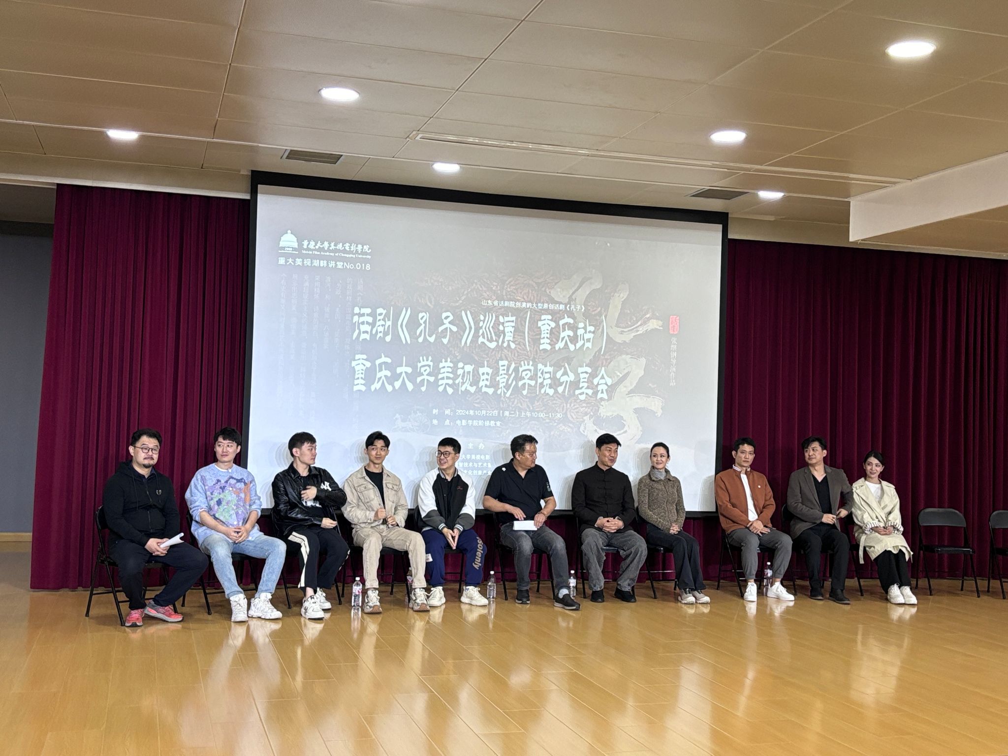 表演系牵头组织的大型原创话剧《孔子》主创交流分享会如期在学院阶梯教室(大讲堂)举行。该剧目由山东省文化和旅游厅出品、山东省话剧院创演,将于10月23日、24日两晚19:30在重庆大剧院上演。