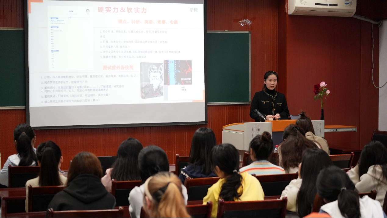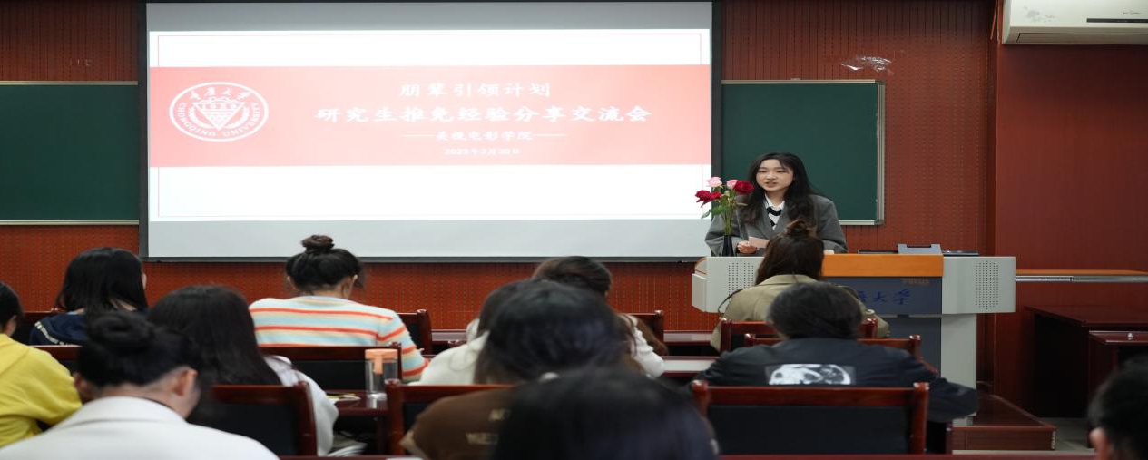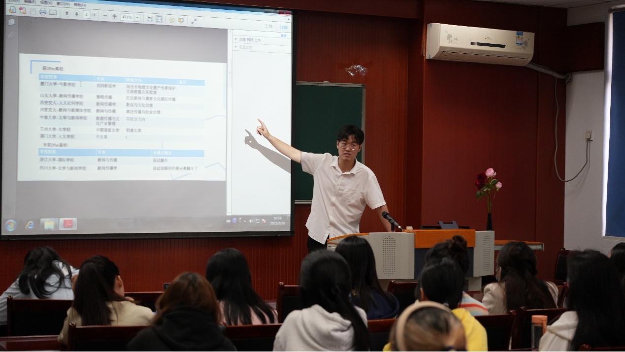 在学院503教室举办了“朋辈引领计划”之研究生推免经验分享交流会,邀请了2019级各专业成功推免研究生的本科生代表谢雨欣、梁子龙、淡安娜、孟星宇、徐玉贺、李孝倩作为分享嘉宾。学院党委副书记赵华,学生工作办公室主任、2021级本科生辅导员厉宣浩,2019级本科生辅导员买瑛以及2022级、2021级60余名本科生参加了此次分享会。会议由2021级播音与主持班专业本科生方恒玥主持。