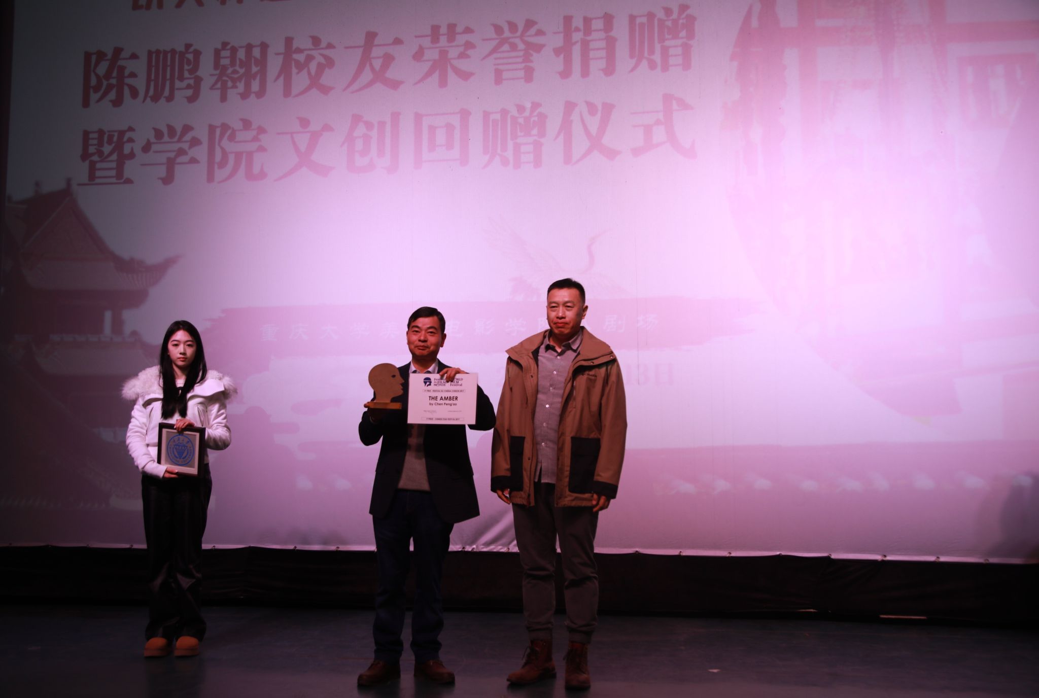 接下来,陈鹏翱怀着对母校的深厚情谊,将蒙特利尔电影节获奖证书和奖杯捐赠给学院,期望激励学弟学妹积极逐梦电影。学院党委书记李阳模代表学院接受捐赠并回赠纪念品,传递学院对校友的牵挂与祝福。