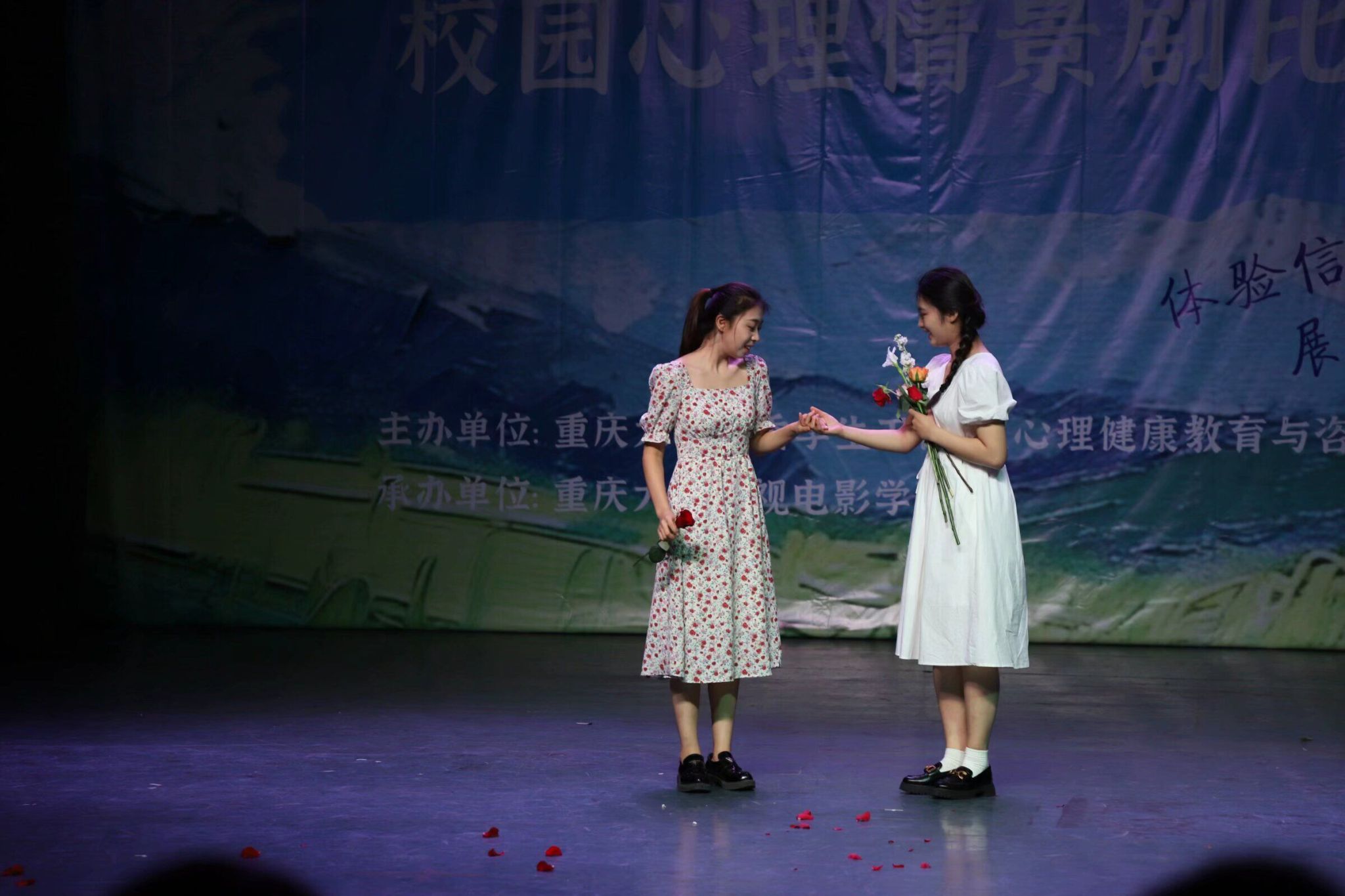 2023级表演专业的同学们带来的原创情景剧《鲜花》中,主角小蝶因患有双相情感障碍,时常在躁狂或抑郁的状态中痛苦不堪,她经历着宿舍矛盾、无法面对与男友间的亲密关系,感觉失去了生活的动力。最终,在老师和家人的帮助下,经过心理治疗的小蝶接纳了自己的不足,与有优点、也有缺陷的自己相拥,看到了未来的希望,鲜花永恒地绽放在了她的心里。该剧目取得总分第三名的成绩。